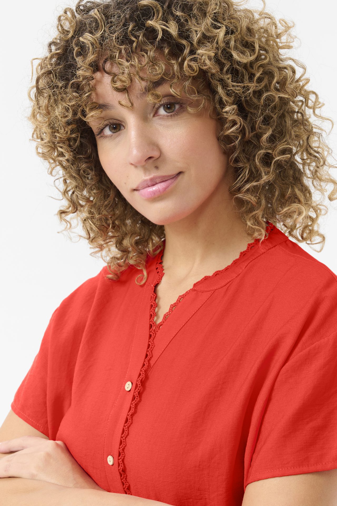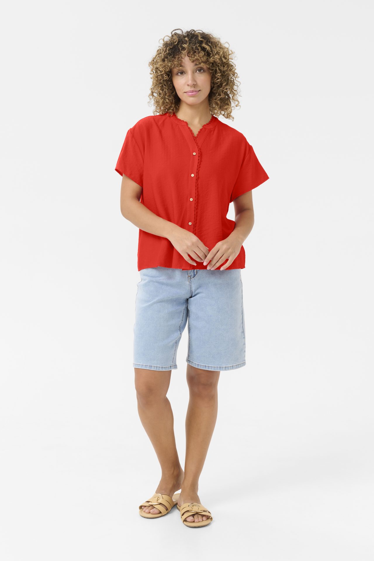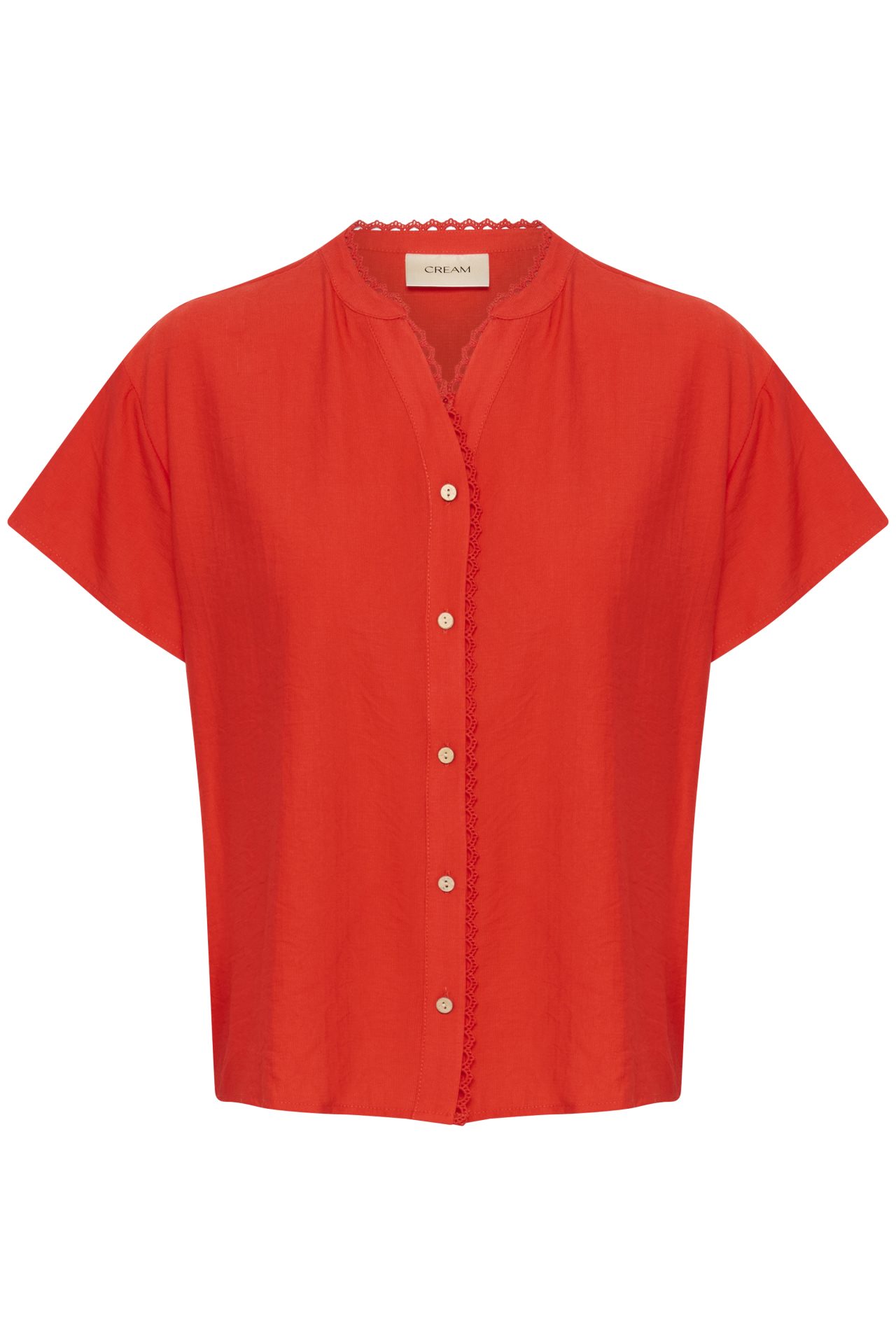 Skjorten lukkes med knapper foran og har fine bånddetaljer langs halsudskæringen, som tilfører et feminint og elegant touch. Det bløde materiale sikrer høj komfort og en let fornemmelse mod huden.